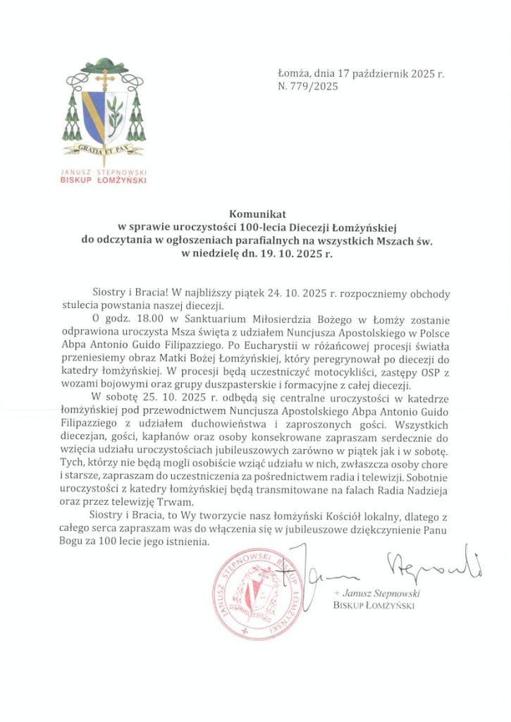 iNFORMACJA Komunikat Biskupa Łomżyńskiego w sprawie uroczystości 100-lecia Diecezji Łomżyńskiej 18 października, 2025 admin Related Posts iNFORMACJA OGŁOSZENIA DUSZPASTERSKIE 10 SIERPNIA 2025r. 9 sierpnia, 20259 sierpnia, 2025 admin iNFORMACJA 2025.06.19 Uroczystość Najświętszego Ciała i Krwi Chrystusa 19 czerwca, 202519 czerwca, 2025 admin